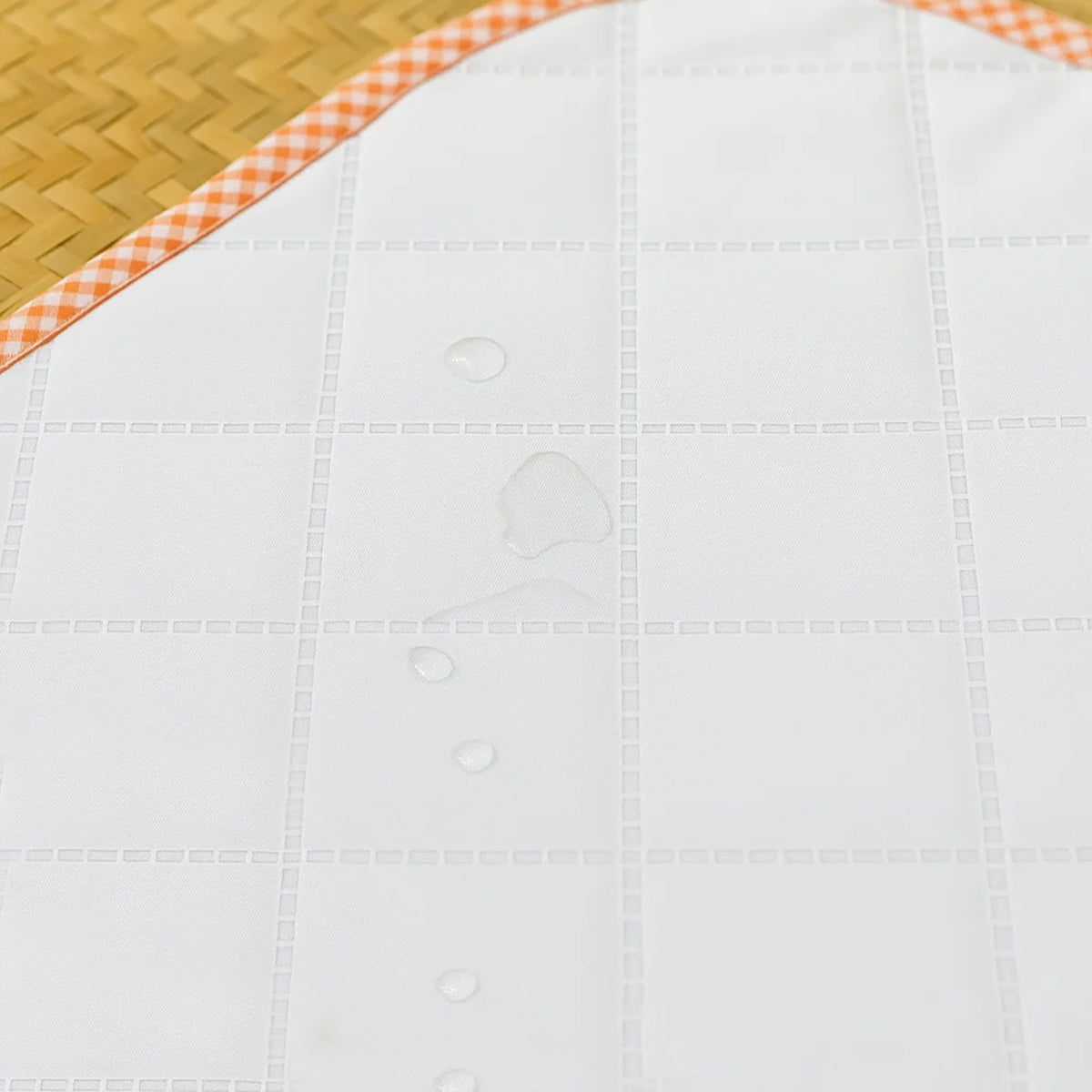 Ytan är tillverkad i 100 % ekologisk bomull med mjuk dubbel gasväv i vitt, medan insidan har ett vattentätt PVC-lager som skyddar mot läckage.